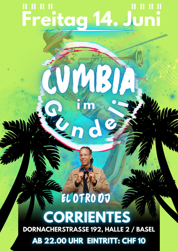 Este Viernes 14 de Junio a partir de las 10 PM bailaremos nuevamente en una noche llena de alegría dedicada especialmente a la CUMBIA en CORRIENTES BASEL con Will El Otro DJ. 🔥🔥🔥 Esta será una noche única para l@s amantes de este popular ritmo musical que ya hace mucho tiempo dejó de ser regional y hoy en día ya es mundial. Aquí todos, desde el punto más austral de Chile hasta los rincones de Tijuana y Monterrey pasando naturalmente por Argentina y su tierra natal Colombia y demás paises Sudamericanos, disfrutaran de una fiesta cargadísima de Cumbia, ricos tragos y buen ambiente. 🤩🥳🤩🥳🤩🥳🤩🥳🤩🥳 No te lo puedes perder! ✨✨✨✨✨✨✨ Am Freitag, den 14. Juni, feiern wir (ab 22 Uhr) erneut eine Nacht voller Freude und CUMBIA im CORRIENTES BASEL mit Will El Otro DJ. 🔥🔥🔥 Dies wird eine einzigartige Nacht für die Enthusiasten dieses beliebten musikalischen Rhythmus sein, der schon lange aufgehört hat regional zu sein und heutzutage ein weltweites Phänomen ist. Vom südlichsten Punkt Chiles bis hoch zum Tijuana und Monterrey, natürlich über Argentinien und selbstverständlich Kolumbien, freuen sich alle auf ein boombastisches Cumbia-Fest, leckere Drinks und einer schönen Atmosphäre. https://www.facebook.com/events/3497140597242633