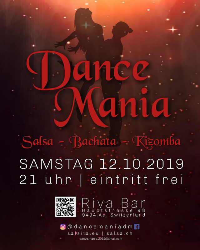 Der Tanzwahn geht weiter! Dance Mania im schönen Riva Bar, mit tollem Boden zum Tanzen und erfrischenden Drinks bietet euch einen gemütlichen Abend voller Genuss!🍹 Party: EINTRITT FREI ! 🎶🎶 Musik: Salsa, Bachata, Kizomba, Mambo, Cha Cha Cha, Urban Kiz, ... #salsa #bachata #kizomba #socialdancing #stgallen #switzerland #dancer #latin #afro #rheintal #lakeofconstance #party #fun #social #saturday #saturdaynight #afrolatin #au #dancenight #dance #dancemaniadm https://www.facebook.com/DanceManiaDM/