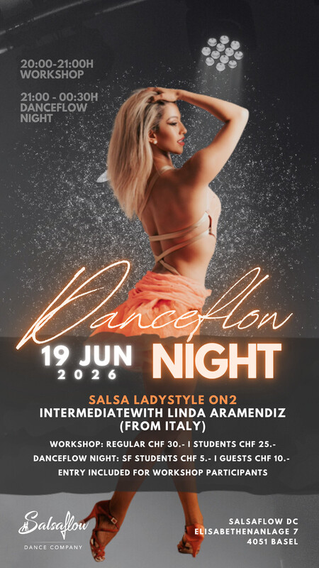 Unsere Danceflow Nights finden jeweils am 1. am 3. und am 5. Freitag eines Monates statt. In lockerer Atmosphäre Freunde treffen und miteinander tanzen und üben, dies ist das Ziel unseres Tanzabends bei Salsaflow. Ob Salsa oder Bachata, es ist für jeden was dabei! Preis? Salsaflow Schüler CHF 5.- Gäste CHF 10.- Diesen Freitag findet ein Salsa On2 Ladystyle Workshop mit Linda Aramendiz aus Italien statt. Du kannst Dich direkt über unsere Website anmelden. https://www.salsaflow-dc.com/kurse/workshops/