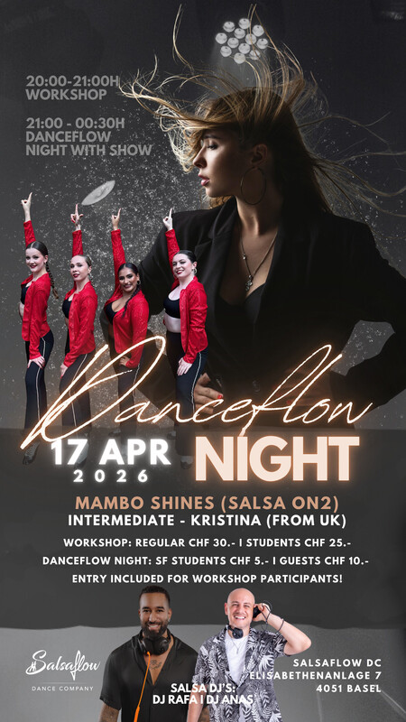 Unsere Danceflow Nights finden jeweils am 1. am 3. und am 5. Freitag eines Monates statt. In lockerer Atmosphäre Freunde treffen und miteinander tanzen und üben, dies ist das Ziel unseres Tanzabends bei Salsaflow. Ob Salsa oder Bachata, es ist für jeden was dabei! Preis? Salsaflow Schüler CHF 5.- Gäste CHF 10.- Unsere DJ's sind: DJ Rafa (Salsa Floor) & DJ Anas (Bachata Floor) Vor der Danceflow Night findet ein Mambo Workshop mit Kristina aus England statt - Für den Workshop kannst du Dich direkt über die Salsaflow Website anmelden. Wir freuen uns auf Dich! https://www.salsaflow-dc.com/kurse/workshops/