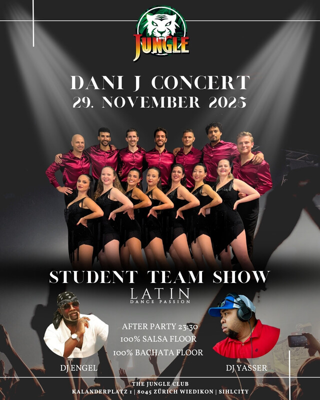 DANI J BACHATA LIVE CONCERT EUROPE TOUR 2025 SAMSATG, 29. NOVEMBER 2025 Der Mega-Star und Bachata-Sänger Dani J kommt mit seiner Europa-Tour 2025 in den The Jungle Club! 💃🕺 Freu dich auf eine Nacht voller Musik, Tanz und unvergesslicher Stimmung. 🔥 ✨ Line-up: 🎤 Live Konzert 💃 Bachata Workshop 🕺 Salsa Show 🎶 Bachata Floor 🔥 Salsa Floor 🎧 DJ Engel 🎧 DJ Yasser 🕒 Timetable: 20:45 Doors open 21:00 Bachata Workshop 22:30 Salsa Student Team Show 22:30 Dani J Live Konzert 23:30 Party 🎟 Tickets: 👉 Early Bird 30 CHF (die ersten 100 Tickets!) 👉 Danach 35 CHF Dani J | Live Konzert | Workshop | Show | Animation | Party www.thejungleclub.ch