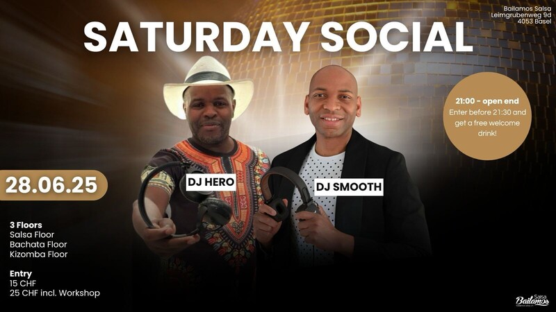 DAS Saturday Social auf drei Floors & Community Area in Basel! Hast du Lust auf einen unvergesslichen Party-Abend voller Salsa, Bachata und Kizomba? Dann bist du beim Saturday Social genau richtig! Feiere mit uns auf gleich drei Floors, triff alte Freunde und knüpfe neue Bekanntschaften in unserer gemütlichen Community Area. Ab 21:00 Uhr bis Open End wird getanzt, gefeiert und gelacht. Wenn du vor 21:30 Uhr eintriffst, bekommst du zur Begrüssung sogar einen Gratis-Drink! Unsere DJs sorgen mit den besten Salsa- und Bachata-Beats für beste Stimmung, und auch ein Teil unseres Lehrerteams ist vor Ort, um dir bei Fragen zur Seite zu stehen und mit dir die Tanzfläche zu rocken. Lass dich von der Atmosphäre mitreissen und gönn dir ein kühles Getränk. Wir freuen uns auf dich! Wann: Jeden vierten Samstag des Monats von 21:00 Uhr bis Open End Wo: Bailamos Salsa Studios, Leimgrubenweg 9d, 4053 Basel Eintritt: 15 CHF Adresse: Leimgrubenweg 9d, 1. Stock, 4053 Basel