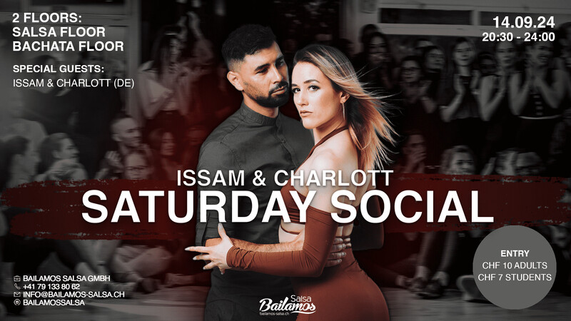 Hast du Lust in entspannter Atmosphäre unserer Tanzstudios, Freunde zu treffen und deine neusten Tanz-Moves zu üben? Dann ist das Special Saturday Social mit unserem Salsa- und Bachata Floor genau das Richtige für dich! Von Acht bis "Open End" kann getanzt, geübt und geplaudert werden. Tanze mit uns auf zwei Floors und gönn dir ein kühles Getränk aus unserem Kühlschrank! Hier ein paar Bilder der vergangenen Events. Wir freuen uns auf dich! Special Guests: Die beiden Bachata Stars Issam & Charlott aus Hamburg werden mit uns den Bachata-Floor unsicher machen! Wann: Samstag, 14.09.2024 um 20:30 bis Open End Wo: Bailamos Salsa Studio 2 (Salsa-Floor) Bailamos Salsa Studio 1 (Bachata-Floor) Eintritt: 10 CHF Erwachsene 7 CHF Schüler / Studenten Adresse: Kohlenberggasse 23, 4051 Basel