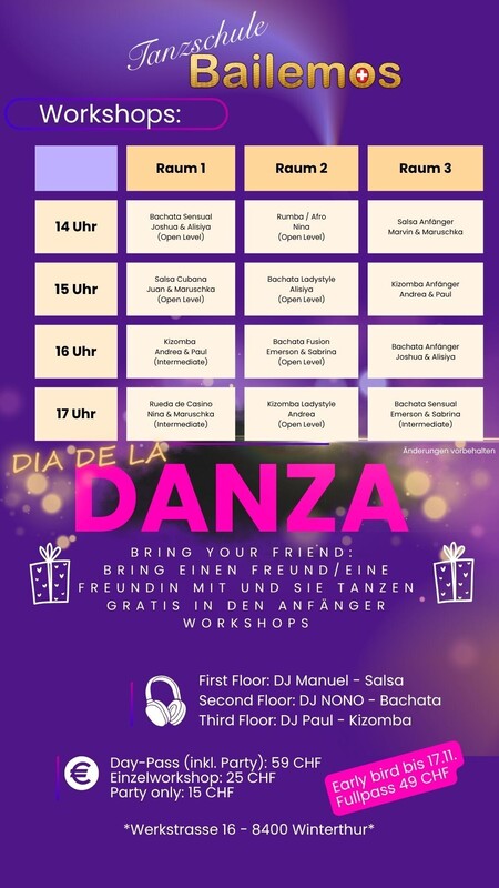 Bailemos Festival – Dia dela Danza Dia dela danza; 12 Workshops und Deine Freunde tanzen gratis in den Anfängerkursen Día de Danza – Das bailemos Festival am 22.11.2025 Ein ganzer Tag voller Tanz, Freude und Inspiration! Erlebe 12 mitreißende Workshops in Salsa, Bachata, Kizomba und Ladystyle mit unserem Top-Lehrerteam – egal ob Anfänger:in oder fortgeschritten, hier ist für alle etwas dabei. Bring your friend! Jeder der einen Fullpass bucht, darf seine Freunde mitbringen. Diese dürfen in den Anfängerkursen gratis Salsa, Bachata oder Kizomba – Luft schnuppern. Was dich erwartet: Ort: Tanzschule bailemos, WinterthurSamstag, 22.11.2025 Workshops von 14:00 bis 18:00 Uhr Party am Abend inklusive! Unschlagbarer Preis: Fullpass bis zum 17.10.25 nur 49.- https://bailemos.ch/festival