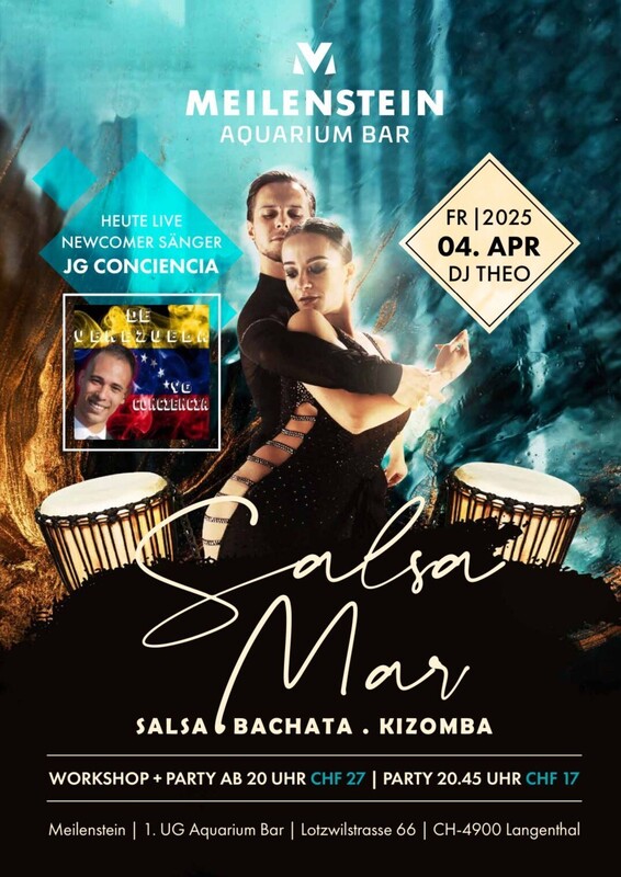 Freitag 4. April 2025 💃 SALSA MAR 💃 20h. bis 20.45h. BACHATA WORKSHOP mit Stephan & Tanja 20.45h. bis 02.00h. Salsa & Bachata und Kizomba mit dem Legendären & Einzigartigen Dj Theo 22h. Live Sänger YG Conciencia (Salsa Venezuela) Unser Salsa Venezuela Special Live Auftritt. Lass dir die Party nicht entgehen Super Stimmung wunderschönes Ambiente 👍 Taucht im atemberaubenden Ambiente der Aquarium Bar ab und Tanzt zu heissen Rhythmen wie Salsa, Bachata und Kizomba 💃Salsa Mar💃Team https://fb.me/e/GObLL7N2P