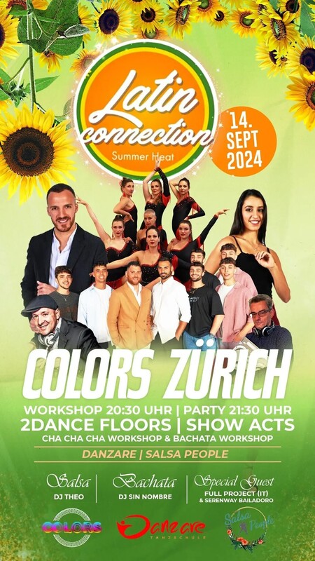Herzlich wilkommen bei Latin Connection Event im COLORS CLUB Zürich mit 2 Dance Floors. SAMSTAG 14.09.2024 ☆☆☆ SPECIAL GUEST ☆☆☆ ♡♡♡ FULL PROJECT (IT) ♡♡♡ =================================== ► PARTY AUF 2 DANCE FLOORS AB 21:30 Uhr ► 2 Gratis Workshops 20:30 Uhr - 21:15 Uhr ► Top Location ► 2 Show Acts ► 1 Big Entertainment ► Best Salsa, Bachata DJ‘s ► Best Salsa, Bachata Teachers =============================== ♡ WELCOME AND ENJOY THE PARTY ♡ * MAIN FLOOR: SALSA im Purple Room -Salsa Puertorriqueña,Timba, Salsa All-Styles, Salsa Romantica, Cha cha cha -On the Mix DJ THEO * 2ND FLOOR: BACHATA im Blue Room - 100% Bachata - On the Mix DJ SIN NOMBRE ► LIVE ACTS ca. 23:30 Uhr im MAIN FLOOR ☆FULL PROJECT (IT) ☆ SERENWAY BAILADORO ================================================ ► WORKSHOPS PROGRAMM 20:30 Uhr - 21:15 Uhr ALL LEVELS WS01 | CHA CHA CHA FULL PROJECT (IT) WS02 | BACHATA PASCAL & SABRINA DANZARE ============================================ ► PREIS Full Pass 2 GRATIS Workshops und Party CHF 25. - ============================================ ► LOCATION: === THE COLORS === Vulkanstrasse 130 | 8048 Zürich - Swiss life Arena https://www.facebook.com/salsacongress/