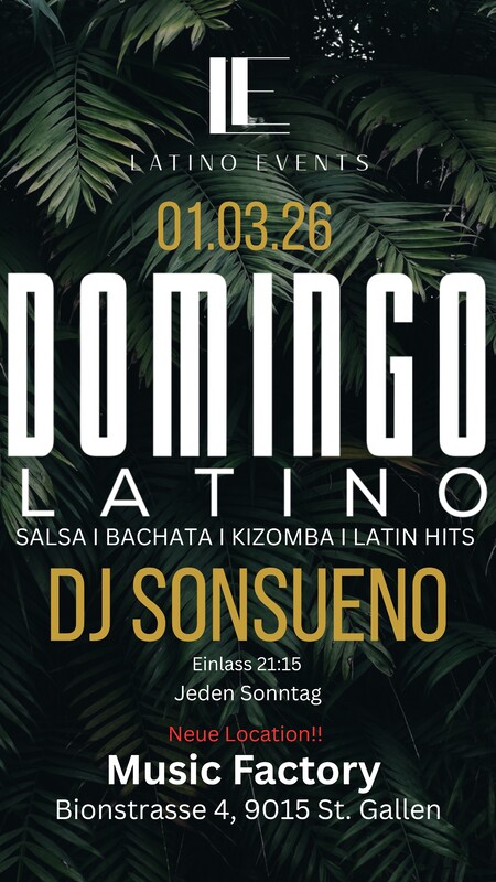‼️‼️ Domingo Latino ‼️‼️ #SALSEROSSILLAMANYOVENGO 🎵🎶 #ESOOOO 💃🕺 #ABAILAR Update: NEW LOCATION! 🔥 Ab sofort tanzen wir jeden Sonntag im Rooftop der Music Factory 📍 Bionstrasse 4, 9015 St. Gallen (4. Stock mit Lift) 🚌 Bus: St. Gallen Russen | Altenwegen 🚗 Gratis Parkplatz – Tiefgarage (2UG/3UG) & Aussenparkplätze 💃 300 m² Dancefloor | Rooftop Vibes | Neue Energie Wie immer erwarten euch das Latino Events Team und unsere Resident DJs mit Salsa, Bachata & Kizomba in einem einmaligen Ambiente ! 🗓 Jeden Sonntag ab 21:15 Uhr Bringt eure Freunde mit und macht den Sonntag zum Highlight der Woche! Domingo Latino – die Party, die euch den Montag vergessen lässt ❤️🔥 #bachata #latinamericandance #salsacubana #salsabachata #kizombaaddict #latino #salsadancing #socialdance #DomingoLatino #fiestalatina