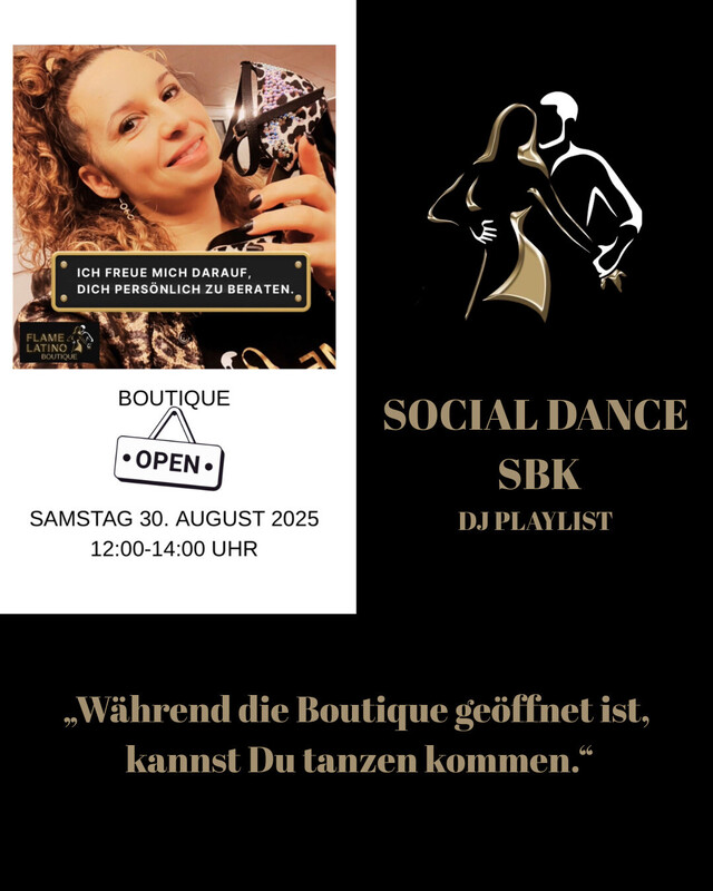 Social Dance SBK Erlebe etwas Besonderes – Tanzen & Shoppen in einzigartiger Atmosphäre! Während unsere Boutique geöffnet ist, kannst du nicht nur stöbern und shoppen, sondern auch tanzen! Entdecke stilvolle Tanzkleider und finde die perfekten Tanzschuhe für deinen nächsten Event – ob Standard, Salsa, Tango oder Discofox. Wir sind die einzige Boutique in der Schweiz, die maßgefertigte Tanzschuhe nach deinen Wünschen anfertigt – für Damen und Herren. Wähle Material, Farbe, Absatzhöhe und Passform – und tanze wie auf Wolken! Komm vorbei und lass dich inspirieren – bei uns wird Shopping zum Tanzerlebnis. FB & INSTA Boutiqueflamelatino