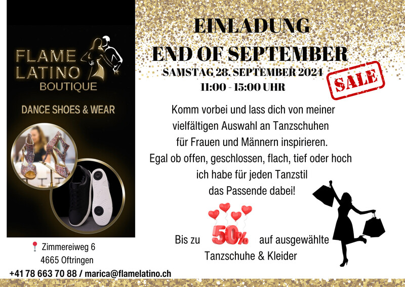 Einladung %SALE% %SALE% %SALE% Komm vorbei und lass Dich von meiner vielfaltigen Auswahl an Tanzschuhen für Frauen & Männer inspirieren. Egal ob offen, geschlossen, flach, tief oder hoch ich habe für jeden Tanzstil das Passende dabei! Bis zu 50% auf ausgewählte Tanzschuhe & Kleider. https://flamelatino.ch/kurs/end-of-semptember-sale/