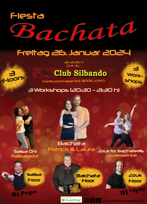 Fiesta Bachata - Deine Social-Dance Party am 4. Freitag des Monates im Club Silbando! Mit 3 Workshops und 3 Floors! Das erwartet dich... *3 Workshops*: Vor der Party finden von 20:30 - 21:30 Uhr drei Workshops statt (CHF 25.- inkl. Party-Eintritt): - Bachata mit Patrick & Laura https://eventfrog.ch/de/p/kurse-seminare/musik-tanz/bachata-workshop-mit-patrick-laura-7134621309057582811.html - Salsa mit Juan Carlos & Nicole (PalBailador) https://eventfrog.ch/de/p/kurse-seminare/musik-tanz/salsa-workshop-mit-juan-carlos-nicole-palbailador-7141566406982580355.html - Brazilian Zouk for Bachater@s mit Corinne & Manu (Zoukessence) https://eventfrog.ch/de/p/kurse-seminare/musik-tanz/brazilian-zouk-workshop-for-bachatero-s-zoukessence-7141567087982353874.html *3 Floors*: - Floor 1: Bachata mit DJ Ñoño - Floor 2: Salsa mit DJ Pepe - Floor 3: Zouk mit DJ *Lyte Abendkasse 15.- CHF Vorverkauf via Eventfrog: https://eventfrog.ch/de/p/party/latin-brasil/fiesta-bachata-7134623204044143197.html ●●● WHATSAPP/TELEGRAM: Komm in die WhatsApp- oder Telegram-Gruppe und bleibe über die kommenden Events informiert: Whatsapp: https://chat.whatsapp.com/DHgqcB4Pe8aFmjpYt2v03c Telegram: https://www.t.me/fiestapasion ●●● Fiesta Bachata Daten 2024: jeweils am 4. Freitag des Monates 23.02.2024 22.03.2024 26.04.2024 24.05.2024 28.06.2024 Sommerpause im Juli 23.08.2024 27.09.2024 25.10.2024 22.11.2024 27.12.2024 ●●● Euer Fiesta Pasion Team https://eventfrog.ch/de/p/party/latin-brasil/fiesta-bachata-7134623204044143197.html