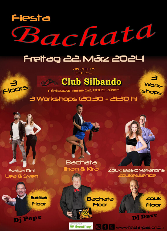 Fiesta Bachata - Deine Social-Dance Party am 4. Freitag des Monates im Club Silbando! Mit 3 Workshops und 3 Floors! Das erwartet dich: *3 Workshops* von 20:30 - 21:30 Uhr (CHF 25.- inkl. Party-Eintritt): - Bachata mit Ilhan & Kira (ik Studios) https://eventfrog.ch/de/p/kurse-seminare/musik-tanz/bachata-workshop-mit-ilhan-kira-ik-studio-7132136292079334875.html - Salsa mit Lea & Sven (SalsaOlé, Fuego y Pasión und Salsa Aarau) https://eventfrog.ch/de/p/kurse-seminare/musik-tanz/salsa-workshop-mit-lea-sven-7159505551902099518.html - Zouk Basic Variations (Zoukessence) https://eventfrog.ch/de/p/kurse-seminare/musik-tanz/brazilian-zouk-workshop-for-bachatero-s-zoukessence-7159503904945700951.html *3 Floors* Party ab 21:30 Uhr (CHF 15.-): - Floor 1: Bachata mit DJ Ñoño - Floor 2: Salsa mit DJ Pepe - Floor 3: Zouk mit DJ Dave Vorverkauf Workshops und Party-Eintritt via Eventfrog: https://eventfrog.ch/de/p/party/latin-brasil/fiesta-bachata-7137525681173260740.html ●●● WHATSAPP/TELEGRAM: Komm in die WhatsApp- oder Telegram-Gruppe und bleibe über die kommenden Events informiert: Whatsapp: https://chat.whatsapp.com/DHgqcB4Pe8aFmjpYt2v03c Telegram: https://www.t.me/fiestapasion ●●● Fiesta Bachata Daten 2024: jeweils am 4. Freitag des Monates 22.03.2024 26.04.2024 24.05.2024 28.06.2024 Sommerpause im Juli 23.08.2024 27.09.2024 25.10.2024 22.11.2024 27.12.2024 ●●● Euer Fiesta Pasion Team