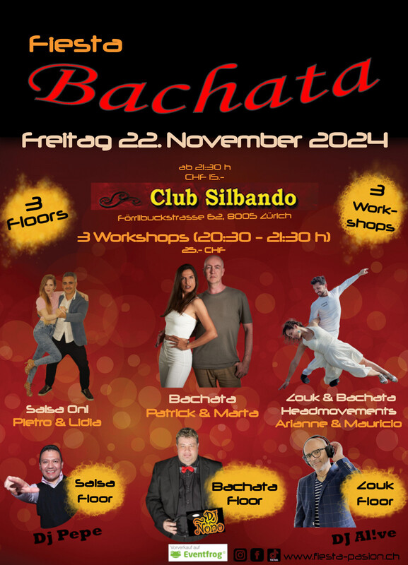 Fiesta Bachata - Deine Social-Dance Party am 4. Freitag des Monates im Club Silbando! Mit 3 Workshops und 3 Floors! Das erwartet dich: *3 Workshops* von 20:30 - 21:30 Uhr (CHF 25.- inkl. Party-Eintritt): - Bachata Workshop mit Patrick & Marta (Bachasuave) -> Vorverkauf https://eventfrog.ch/de/p/kurse-seminare/musik-tanz/bachata-workshop-mit-patrick-marta-bachasuave-7244097263802248459.html - Salsa Workshop mit Pietro & Lidia (SalsaJam / Salsa Aarau) -> Vorverkauf https://eventfrog.ch/de/p/kurse-seminare/musik-tanz/salsa-workshop-mit-lidia-pietro-salsajam-salsa-aarau-7244097622226498626.html - Zouk & Bachata Headmovements mit Arianne & Mauricio -> Vorverkauf https://eventfrog.ch/de/p/kurse-seminare/musik-tanz/bachata-workshop-mit-patrick-marta-bachasuave-7244097263802248459.html *3 Floors* Party ab 21:30 Uhr (CHF 15.-): - Floor 1: Bachata mit DJ Ñoño - Floor 2: Salsa mit DJ Pepe - Floor 3: Zouk mit DJ Al!ve Vorverkauf Workshops und Party-Eintritt via Eventfrog: https://eventfrog.ch/de/p/party/latin-brasil/fiesta-bachata-7244097976519300429.html ●●● WHATSAPP/TELEGRAM: Komm in die WhatsApp- oder Telegram-Gruppe und bleibe über die kommenden Events informiert: Whatsapp: https://chat.whatsapp.com/DHgqcB4Pe8aFmjpYt2v03c Telegram: https://www.t.me/fiestapasion ●●● Fiesta Bachata Daten 2024: jeweils am 4. Freitag des Monates 27.12.2024 ●●● Euer Fiesta Pasion Team #bachata #salsa #dance #bachatasensual #bachatadancing #kizomba #merengue #bachatadance #reggaeton #salsadancing #bachatalove #dancer #music #bachatafusion #dancing #hiphop #dancers #bachatalovers #latindance #bachateros #bachatadominicana #musica #love #baile #socialdance #bachatadancers #latino #salsacubana #dembow #romeosantos