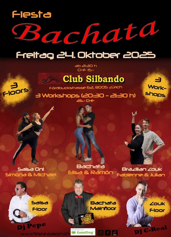 Fiesta Bachata - Deine Social-Dance Party am 4. Freitag des Monates im Club Silbando! Mit 3 Workshops und 3 Floors! Das erwartet dich: *3 Workshops* von 20:30 - 21:30 Uhr (CHF 25.- inkl. Party-Eintritt): - Bachata mit Elisa y Ramón Vorverkauf: https://eventfrog.ch/de/p/kurse-seminare/musik-tanz/bachata-workshop-mit-elisa-y-ramon-7375161684917282331.html - Salsa mit Simona & Michael Vorverkauf: https://eventfrog.ch/de/p/kurse-seminare/musik-tanz/salsa-on1-workshop-mit-simona-michael-7375162085074808694.html - Zouk for Bachater@s mit Fabienne & Julian Vorverkauf: https://eventfrog.ch/de/p/kurse-seminare/musik-tanz/brazilian-zouk-for-bachater-s-mit-fabienne-julian-7375162543197692672.html *3 Floors* Party ab 21:30 Uhr (CHF 15.-): - Floor 1: Bachata mit DJ Ñoño - Floor 2: Salsa mit DJ Pepe - Floor 3: Zouk mit DJ C-Real Vorverkauf Workshops und Party-Eintritt via Eventfrog: https://eventfrog.ch/de/p/party/latin-brasil/fiesta-bachata-7375162988666295311.html ●●● WHATSAPP/TELEGRAM: Komm in die WhatsApp- oder Telegram-Gruppe und bleibe über die kommenden Events informiert: Whatsapp: https://chat.whatsapp.com/DHgqcB4Pe8aFmjpYt2v03c Telegram: https://www.t.me/fiestapasion ●●● Fiesta Bachata Daten 2025: jeweils am 4. Freitag des Monates 28.11.2025 26.12.2025 ●●● Euer Fiesta Pasion Team #bachata #salsa #dance #bachatasensual #bachatadancing #kizomba #merengue #bachatadance #reggaeton #salsadancing #bachatalove #dancer #music #bachatafusion #dancing #hiphop #dancers #bachatalovers #latindance #bachateros #bachatadominicana #musica #love #baile #socialdance #bachatadancers #latino #salsacubana #dembow #romeosantos