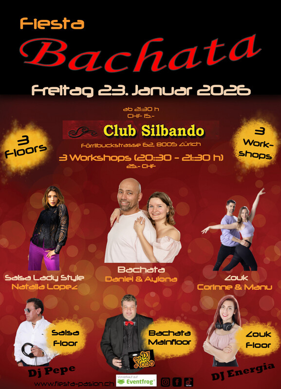 Fiesta Bachata - Deine Social-Dance Party am 4. Freitag des Monates im Club Silbando! Mit 3 Workshops und 3 Floors! Das erwartet dich: *3 Workshops* von 20:30 - 21:30 Uhr (CHF 25.- inkl. Party-Eintritt): - Bachata mit Daniel & Alyona Vorverkauf: https://eventfrog.ch/de/p/kurse-seminare/musik-tanz/bachata-workshop-mit-daniel-christina-la-gatita-esp-7411854690344793739.html - Salsa Lady Style mit Natalia Lopez Vorverkauf: https://eventfrog.ch/de/p/kurse-seminare/musik-tanz/salsa-lady-style-workshop-mit-natalia-lopez-7411532248296480647.html - Zouk - Shadow Position mit Corinne & Manu Vorverkauf: https://eventfrog.ch/de/p/kurse-seminare/musik-tanz/zouk-workshop-shadow-position-mit-corinne-manu-7411534204511471382.html *3 Floors* Party ab 21:30 Uhr (CHF 15.-): - Floor 1: Bachata mit DJ Ñoño - Floor 2: Salsa mit DJ Pepe - Floor 3: Zouk mit DJ Energia Abendkasse: 15.- CHF Vorverkauf Workshops und Party-Eintritt via Eventfrog: https://eventfrog.ch/de/p/party/latin-brasil/fiesta-bachata-7411859468361687373.html ●●● WHATSAPP/TELEGRAM: Komm in die WhatsApp- oder Telegram-Gruppe und bleibe über die kommenden Events informiert: Whatsapp: https://chat.whatsapp.com/DHgqcB4Pe8aFmjpYt2v03c Telegram: https://www.t.me/fiestapasion ●●● Fiesta Bachata Daten 2026: (jeweils am 4. Freitag des Monates) - 23.1.2026 - 27.2.2026 - 27.3.2026 - 24.4.2026 - 22.5.2026 - 26.6.2026 Sommerpause im Juli - 28.8.2026 - 25.9.2026 - 23.10.2026 - 27.11.2026 - 25.12.2026 ●●● Euer Fiesta Pasion Team #bachata #salsa #dance #bachatasensual #bachatadancing #kizomba #merengue #bachatadance #reggaeton #salsadancing #bachatalove #dancer #music #bachatafusion #dancing #hiphop #dancers #bachatalovers #latindance #bachateros #bachatadominicana #musica #love #baile #socialdance #bachatadancers #latino #salsacubana #dembow #romeosantos