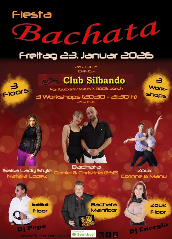 Fiesta Bachata - Deine Social-Dance Party am 4. Freitag des Monates im Club Silbando! Mit 3 Workshops und 3 Floors! Das erwartet dich: *3 Workshops* von 20:30 - 21:30 Uhr (CHF 25.- inkl. Party-Eintritt): - Bachata mit Daniel & Christina la Gatita (ESP) Vorverkauf: https://eventfrog.ch/de/p/kurse-seminare/musik-tanz/bachata-workshop-mit-daniel-christina-la-gatita-esp-7411854690344793739.html - Salsa Lady Style mit Natalia Lopez Vorverkauf: https://eventfrog.ch/de/p/kurse-seminare/musik-tanz/salsa-lady-style-workshop-mit-natalia-lopez-7411532248296480647.html - Zouk - Shadow Position mit Corinne & Manu Vorverkauf: https://eventfrog.ch/de/p/kurse-seminare/musik-tanz/zouk-workshop-shadow-position-mit-corinne-manu-7411534204511471382.html *3 Floors* Party ab 21:30 Uhr (CHF 15.-): - Floor 1: Bachata mit DJ Ñoño - Floor 2: Salsa mit DJ Pepe - Floor 3: Zouk mit DJ Energia Abendkasse: 15.- CHF Vorverkauf Workshops und Party-Eintritt via Eventfrog: https://eventfrog.ch/de/p/party/latin-brasil/fiesta-bachata-7411859468361687373.html ●●● WHATSAPP/TELEGRAM: Komm in die WhatsApp- oder Telegram-Gruppe und bleibe über die kommenden Events informiert: Whatsapp: https://chat.whatsapp.com/DHgqcB4Pe8aFmjpYt2v03c Telegram: https://www.t.me/fiestapasion ●●● Fiesta Bachata Daten 2026: (jeweils am 4. Freitag des Monates) - 23.1.2026 - 27.2.2026 - 27.3.2026 - 24.4.2026 - 22.5.2026 - 26.6.2026 Sommerpause im Juli - 28.8.2026 - 25.9.2026 - 23.10.2026 - 27.11.2026 - 25.12.2026 ●●● Euer Fiesta Pasion Team #bachata #salsa #dance #bachatasensual #bachatadancing #kizomba #merengue #bachatadance #reggaeton #salsadancing #bachatalove #dancer #music #bachatafusion #dancing #hiphop #dancers #bachatalovers #latindance #bachateros #bachatadominicana #musica #love #baile #socialdance #bachatadancers #latino #salsacubana #dembow #romeosantos