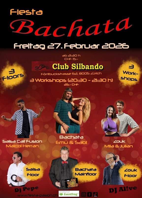 Fiesta Bachata - Deine Social-Dance Party am 4. Freitag des Monates im Club Silbando! Mit 3 Workshops und 3 Floors! Das erwartet dich: *3 Workshops* von 20:30 - 21:30 Uhr (CHF 25.- inkl. Party-Eintritt): - Bachata mit Emu & Sabi Vorverkauf: https://eventfrog.ch/de/p/kurse-seminare/musik-tanz/bachata-workshop-mit-emu-sabi-7411902855974497804.html - Salsa Cali Fusion mit Maicol Herran (PasoLatino) Vorverkauf: https://eventfrog.ch/de/p/kurse-seminare/musik-tanz/salsa-cali-fusion-workshop-mit-maicol-herran-pasolatino-7411901253255442454.html - Zouk Workshop - Travelling the Room mit Mila & Julian Vorverkauf: https://eventfrog.ch/de/p/kurse-seminare/musik-tanz/zouk-workshop-travelling-the-room-mit-mila-julian-7411902190028117143.html *3 Floors* Party ab 21:30 Uhr (CHF 15.-): - Floor 1: Bachata mit DJ Ñoño - Floor 2: Salsa mit DJ Pepe - Floor 3: Zouk mit DJ Energia Abendkasse: 15.- CHF Vorverkauf Workshops und Party-Eintritt via Eventfrog: https://eventfrog.ch/de/p/party/latin-brasil/fiesta-bachata-7411903033792021972.html ●●● WHATSAPP/TELEGRAM: Komm in die WhatsApp- oder Telegram-Gruppe und bleibe über die kommenden Events informiert: Whatsapp: https://chat.whatsapp.com/DHgqcB4Pe8aFmjpYt2v03c Telegram: https://www.t.me/fiestapasion ●●● Fiesta Bachata Daten 2026: (jeweils am 4. Freitag des Monates) - 23.1.2026 - 27.2.2026 - 27.3.2026 - 24.4.2026 - 22.5.2026 - 26.6.2026 Sommerpause im Juli - 28.8.2026 - 25.9.2026 - 23.10.2026 - 27.11.2026 - 25.12.2026 ●●● Euer Fiesta Pasion Team #bachata #salsa #dance #bachatasensual #bachatadancing #kizomba #merengue #bachatadance #reggaeton #salsadancing #bachatalove #dancer #music #bachatafusion #dancing #hiphop #dancers #bachatalovers #latindance #bachateros #bachatadominicana #musica #love #baile #socialdance #bachatadancers #latino #salsacubana #dembow #romeosantos