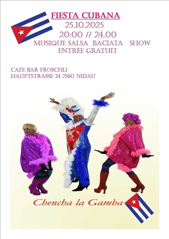 Café Bar Fröschli Jorge Pinillos Ortiz 25 de octubre de 2025 20:00 show Fiesta Cubana Show música cubana salsa bachata Precio de entrada: CHF 0.00 Share on Facebook Eventos sáb, 25. oct 20:00 show Fiesta Cubana Café Bar Fröschli Nidau