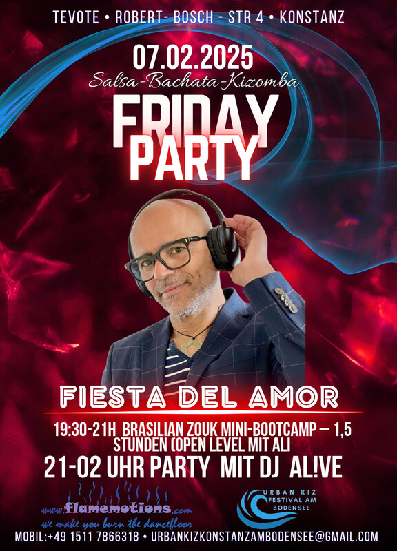 ✵✵✵ Fiesta del Amor ✵✵✵ SALSA, BACHATA & KIZOMBA 🌟🎉💃 Tanze mit voller Leidenschaft! 🕺🎶✨ 📅 Wann? Freitag, 07. Februar 2025 📍 Wo? Tevote Robert-Bosch-Str. 4, 78467 Konstanz 🔗 Event-Link: https://www.facebook.com/share/18Vc6sTZzJ/ 💵 Eintritt: Auf Spendenbasis, um die Gage des DJs und die Raummiete zu decken. 💖 ✨ Programm: 🕗 19:30 – 21:00 Uhr: Brazilian Zouk Mini-Bootcamp (Open Level) mit Ali – 15 € pro Person 🪗🎼 🕘 Ab 21:00 Uhr: 🎧 Party mit DJ AL!VE 🎶 👉 SALSA 💃 👉 BACHATA 🕺 👉 KIZOMBA 💞 🥂 Special Highlight: Kostenloser Willkommens-Sekt von 21:00 bis 22:00 Uhr 🍾✨ 🌹 Verbringe mit uns einen unvergesslichen Abend voller Musik, Tanz und Leidenschaft! 🌟🎵 Wir freuen uns auf euch! Euer Team von Flamemotions & Urban Kiz Konstanz 💃🕺✨ 🔥🔥🔥🔥🔥🔥🔥 https://www.facebook.com/share/18Vc6sTZzJ/