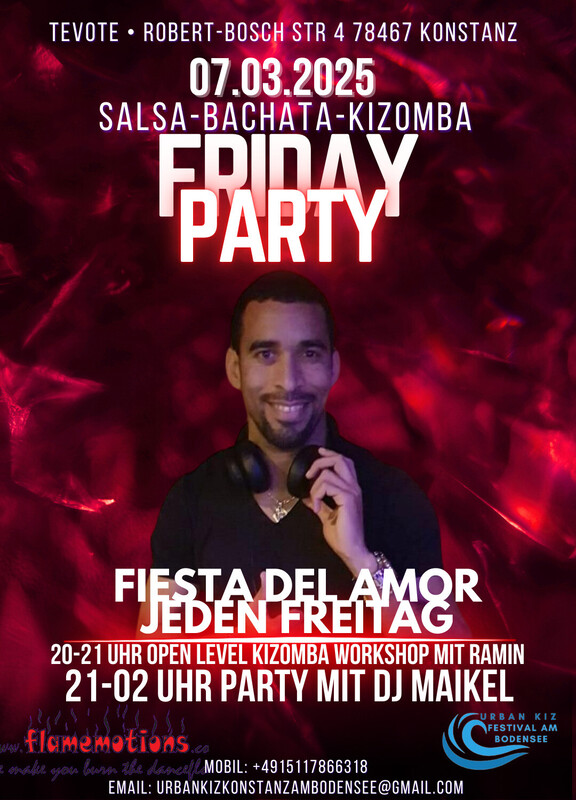 ༻ 𝐅𝐈𝐄𝐒𝐓𝐀 𝐃𝐄𝐋 𝐀𝐌𝐎𝐑 ༺ 𝐉𝐄𝐃𝐄𝐍 𝐅𝐑𝐄𝐈𝐓𝐀𝐆 𝐀𝐁𝐄𝐍𝐃 ❦ Salsa ❦ Bachata ❦ Kizomba ❦ Taucht ein in die Welt der Musik und des Tanzes! Die Fiesta del Amor lädt euch zu einer unvergesslichen Nacht voller Leidenschaft, Freude und lateinamerikanischer Rhythmen ein. Ob Salsa-, Bachata- oder Kizomba-Fan – hier kommen Tanzbegeisterte zusammen, um gemeinsam zu feiern! 📅 Wann? Jeden Freitag 🕖 Programm: 20:00 Uhr: Workshop (Open Level – für alle geeignet) 21:00 - 22:00 Uhr: Begrüßung mit einem Glas Sekt – stoßt mit uns an! 21:00 Uhr: Party-Beginn – Die Tanzfläche gehört euch! Unser DJ sorgt bis 02:00 Uhr für die perfekte Mischung aus Salsa, Bachata und Kizomba. ✨ Eintritt: Der Eintritt auf Spendenbasis um die Gage des DJs und die Raummiete zu decken. 🍹 Wichtiger Hinweis: Bitte bringt keine eigenen Getränke mit. Unsere Bar bietet euch eine Auswahl an kühlen Drinks, um euren Abend perfekt zu machen. 📍 Location: Robert-Bosch-Straße 4, 78467 Konstanz 🎊 Besondere Highlights: 💃 Professioneller Tanzboden für das ultimative Tanzvergnügen 🚗 Kostenlose Parkplätze direkt vor Ort Verpasst nicht diese besondere Nacht! Tanzt, feiert und genießt die Fiesta del Amor mit uns – jeden Freitag! Wir freuen uns auf euch! 🌴🎶💃🕺 https://www.facebook.com/share/12GKBvv3Je8/