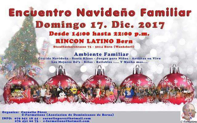 Con mucho gusto tenemos el placer de invitar a todos los dominicanos y amigos de la comunidad dominicana residente en Suiza al tradicional encuentro navideño que por 16 años celebramos en Berna para todos. Este evento se caracteriza por ser abierto para todos, pero, con alto enfasis en las familias. COMIDAS Navideñas, SANTA Klaus, Personajes Animados de Disney World, Regalos de parte de los patrocinadores, artistas en vivo, mercado de productos dominicanos y bailables hasta las 10 de la noche. No se lo pierdan junto a sus familiares y amigos.