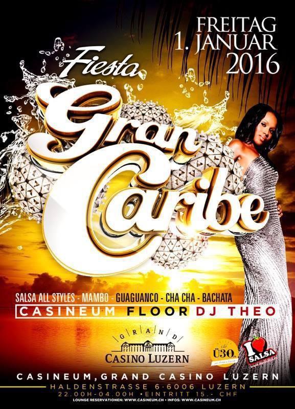 Grand Casino Luzern und I Love Salsa Switzerland Presents: ★ GRAN CARIBE ★ Fiesta Latina ★ WILLKOMMEN 2016 Freitag 01. Dezember 2016 - Türöffnung 22:00h Die ultimative Latin Party in der Zentralschweiz. DJ THEO in the Mix Salsa All Styles / Bachata / Mambo/ Cha Cha Cha / Merengue / Kizomba / Latin Hits & Tropical PARKHÄUSER LUZERN Damit Sie uns auch finden... Über 1500 Parkplätze in nächster Nähe! http://www.pls-luzern.ch/index.php?section=home EINTRITT Der Eintritt ist 15.- Sfr. ohne Garderobe Garderobe ist obligatorisch EINLASSPOLITIK An jedem Freitag im Monat findet im Casineum, Grand Casino Luzern ein Event aus der ClubÜ30.ch Reihe statt. Mit dem ClubÜ30.ch wurde in der Zentralschweiz ein Meetingpoint für ein erwachsenes Ausgangspublikum geschaffen. Hier treffen sich ausgehfreudige Leute, die im Leben stehen und es auch entsprechend geniessen. Da das Alter bekanntlich jedoch nur eine Zahl ist, behält sich das Casineum, die Einlasspolitik betreffend, eine gewisse Flexibilität vor. Prinzipiell kommt es darauf an, dass die Chemie und das Ambiente stimmen und bei gemischten Gruppen keiner ausgeschlossen werden muss (25+). CASINEUM, Grand Casino Luzern Das Casineum im Grand Casino Luzern gehört zu den beliebtesten Ausgehzielen der Zentralschweiz. Der neobarocke Palastsaal bietet ein stimmungsvolles Ambiente und Genuss vom Feinsten für jeden Anspruch. Egal ob im Parterre, im VIP Bereich auf der Galerie, auf der Lake Terrasse oder im puristisch eingerichteten The Club, die Gäste des Casineum geniessen exklusive Club Nächte. Wochenende für Wochenende finden die besten Partylabels statt und die heiligen Hallen erwachen zu einem Partytempel. Eine Top Sound & Light Inszenierung und internationale DJs runden das Partyvergnügen ab. Für Lounge Reservationen und Infos erreichbar unter: reservation@casineum.ch oder online unter: www.casineum.ch CASINEUM @ GRAND CASINO LUZERN Haldenstrasse 6, 6006 Luzern www.casineum.ch - reservation@casineum.ch