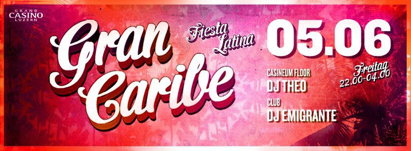 Grand Casino Luzern und I Love Salsa Switzerland Presents: ★ Fiesta Latina GRAN CARIBE ★ Freitag 5. Juni 2015 - Türöffnung 22:00h Die ultimative Latin Party in der Zentralschweiz mit 2 Dance Floors DANCE FLOOR 1 (Casineum) DJ THEO Salsa On1 & On2 / Bachata / Mambo/ Cha Cha Cha / Merengue / Kizomba DANCE FLOOR 2 (The Club) Cuban Floor DJ EMIGRANTE Salsa Cubana / Timba / Cubaton / Latin Hits & Tropical NÄCHSTE DATEN GRAN CARIBE Juli, August, September, Oktober, November, Dezember PARKHÄUSER LUZERN Damit Sie uns auch finden... Über 1500 Parkplätze in nächster Nähe! http://www.pls-luzern.ch/index.php?section=home EINTRITT Der Eintritt ist 15.- Sfr. ohne Garderobe Garderobe ist Obligatorisch INFOS Der Zutritt ins Casineum ist nur für Personen ab 18 Jahren gestattet. Für den Eintritt ist ein gültiges amtliches Ausweisdokument (Pass, Identitätskarte oder Führerschein) sowie gepflegte Kleidung erforderlich. Eingang ist beim Haupteingang vom Grand Casino Luzern. CASINEUM & THE CLUB @ GRAND CASINO LUZERN Haldenstrasse 6 ,6006 Luzern / Switzerland www.casineum.ch - www.ilovesalsa.ch Lounge Reservierung: Tel: 076 390 09 54 Viel Spass wünschen euch: Yves & Theo.