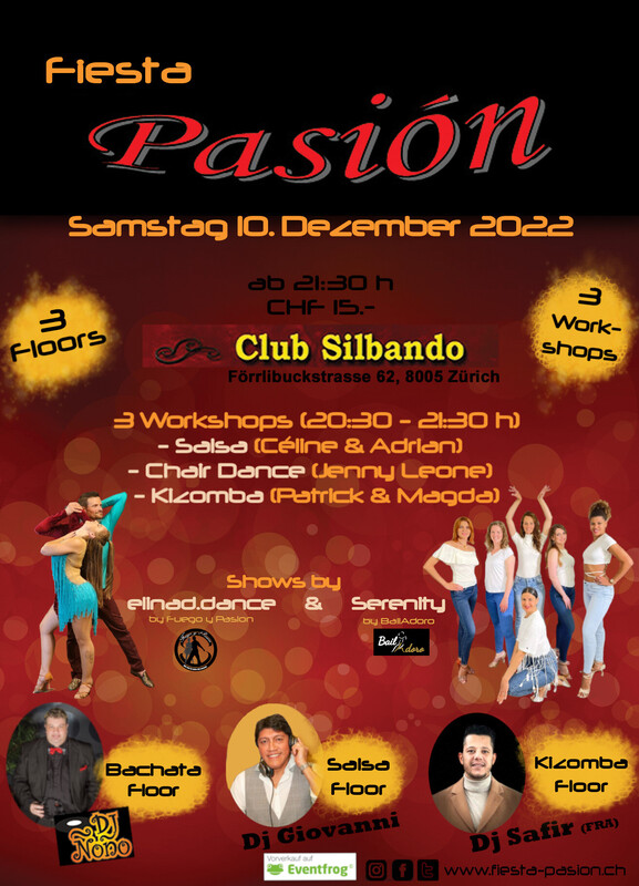 Fiesta Pasión - Deine Social-Dance Party am 2. Samstag des Monates im Club Silbando! *3 Floors*: - Floor 1: Salsa mit DJ Giovanni - Floor 2: Bachata mit DJ Ñoño - Floor 3: Kizomba mit DJ Safir & DJ Patrick *3 Workshops*: Vor der Party finden von 20:30 - 21:30 Uhr drei Workshops statt (CHF 25.- inkl. Party-Eintritt): - Salsa mit Céline und Adrian (elinad.dance by Fuego y Pasión) https://eventfrog.ch/de/p/kurse-seminare/musik-tanz/salsa-workshop-mit-celine-adrian-elinad-dance-6982819799576252019.html - Chair Dance by Jenny Leone https://eventfrog.ch/de/p/kurse-seminare/musik-tanz/chair-dance-workshop-by-jenny-leone-polelicious-6982820702836398111.html - Kizomba mit Patrick & Magda https://eventfrog.ch/de/p/kurse-seminare/musik-tanz/kizomba-workshop-mit-paul-andrea-6982820335167902454.html Shows von elinad.dance (by Fuego y Pasión) und Serenity (by BailaAdoro) Vorverkauf via Eventfrog oder Abendkasse 15.- CHF https://eventfrog.ch/de/p/party/latin-brasil/fiesta-pasion-6982818369335362560.html
