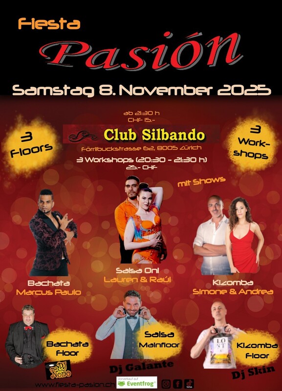 Fiesta Pasión- Deine Social-Dance Party am 2. Samstag des Monates im Club Silbando! Mit 3 Workshops und 3 Floors! Das erwartet dich: *3 Workshops* von 20:30 - 21:30 Uhr (CHF 25.- inkl. Party-Eintritt): - Salsa - Lauren & Raúl (Salsabrosa) - Bachata - Marcus Paulo (Dance Spot Zürich) - Kizomba - Simone & Andrea (Kizombatouch) *3 Floors* - Party ab 21:30 Uhr (CHF 15.-): - Floor 1: Salsa mit DJ Galante - Floor 2: Bachata mit DJ Ñoño - Floor 3: Kizomba mit DJ Skin *3 Shows* - 23:45 Uhr (Saal 1 - Salsa Floor): - Marcus Paulo & Las Felina (Bachata Fusion) - Alicia y Andres (Salsa) - Brando Pérez y Viviana Vargas - COLOMBIA (Salsa Caleña) Vorverkauf Workshops und Party-Eintritt via Eventfrog: https://eventfrog.ch/de/p/party/latin-brasil/fiesta-pasion-7376737278633237195.html ●●● WHATSAPP/TELEGRAM: Komm in die WhatsApp- oder Telegram-Gruppe und bleibe über die kommenden Events informiert: Whatsapp: https://chat.whatsapp.com/DHgqcB4Pe8aFmjpYt2v03c Telegram: https://www.t.me/fiestapasion ●●● Fiesta Pasión Daten 2025: (jeweils am 2. Samstag des Monates) 08.11.2025 13.12.2025 ------------------------------ Dein Fiesta-Pasión Team #salsa #bachata #dance #salsadancing #music #a #salseros #merengue #kizomba #colombia #salsacubana #reggaeton #dancer #salsadance #puertorico #bachatasensual #salsamusic #dancing #musica #hiphop #rumba #salsaromantica #mambo #cuba #dancers #salsaon #venezuela #latino #latindance #love