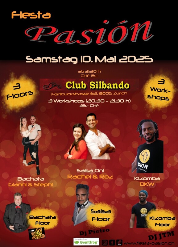 Fiesta Pasión- Deine Social-Dance Party am 2. Samstag des Monates im Club Silbando! Mit 3 Workshops und 3 Floors! Das erwartet dich: *2 Workshops* von 20:30 - 21:30 Uhr (CHF 25.- inkl. Party-Eintritt): - Salsa mit Rachel und Roz (Rhythmia) Vorverkauf: https://eventfrog.ch/de/p/kurse-seminare/musik-tanz/salsa-on1-workshop-mit-rachel-roz-rhythmia-7315824020628225152.html - Bachata mit Gianni & Stephi Vorverkauf: https://eventfrog.ch/de/p/kurse-seminare/musik-tanz/bachata-flow-workshop-mit-gianni-stephi-7312947919291690489.html - Kizomba mit DKW (Dance Kizomba Winterthur) Vorverkauf: https://eventfrog.ch/de/p/kurse-seminare/musik-tanz/urban-kiz-workshop-mit-dkw-7312949980771160724.html *2 Floors* - Party ab 21:30 Uhr (CHF 15.-): - Floor 1: Salsa mit DJ Pietro - Floor 2: Bachata mit DJ Ñoño - Floor 3: Kizomba mit DJ JTM Vorverkauf Workshops und Party-Eintritt via Eventfrog: https://eventfrog.ch/de/p/party/latin-brasil/fiesta-pasion-7315824636909910764.html ●●● WHATSAPP/TELEGRAM: Komm in die WhatsApp- oder Telegram-Gruppe und bleibe über die kommenden Events informiert: Whatsapp: https://chat.whatsapp.com/DHgqcB4Pe8aFmjpYt2v03c Telegram: https://www.t.me/fiestapasion ●●● Fiesta Pasión Daten 2025: (jeweils am 2. Samstag des Monates) 14.06.2025 12.07.2025 Sommerpause 13.09.2025 11.10.2025 08.11.2025 13.12.2025 ------------------------------ Dein Fiesta-Pasión Team #salsa #bachata #dance #salsadancing #music #a #salseros #merengue #kizomba #colombia #salsacubana #reggaeton #dancer #salsadance #puertorico #bachatasensual #salsamusic #dancing #musica #hiphop #rumba #salsaromantica #mambo #cuba #dancers #salsaon #venezuela #latino #latindance #fiestapasion