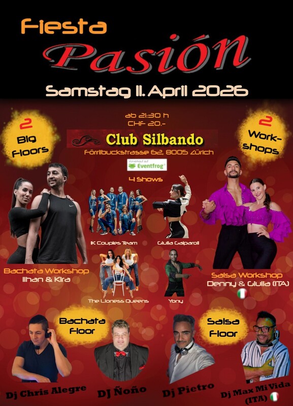 Spring Special mit Denny Imperial & Giulia Galparoli (ITA) und DJ Max mi Vida (ITA) Fiesta Pasión - Deine Social-Dance Party am 2. Samstag des Monates im Club Silbando! Im Rahmen dieses New Years' Special haben wir gleich 4 DJs am Start... u.a. DJ Max Mi Vida aus Italien!! Das erwartet dich... *2 Workshops*: Vor der Party finden von 20:30 - 21:30 Uhr zwei Workshops statt (CHF 30.- inkl. Party-Eintritt): - Salsa mit Denny Imperiale & Giulia Galparoli (ITA) Vorverkauf: https://eventfrog.ch/de/p/kurse-seminare/musik-tanz/salsa-workshop-mit-denny-imperial-giulia-galparoli-ita-7436863902850248372.html - Bachata Workshop mit Ilhan & Kira (ITA) -> Vorverkauf Vorverkauf: https://eventfrog.ch/de/p/kurse-seminare/musik-tanz/bachata-workshop-mit-ilhan-kira-7436872091142497476.html *2 Big Floors*: - Floor 1: Salsa mit DJ Max mi Vida (ITA) und DJ Pietro - Floor 2: Bachata mit DJ Ñoño und DJ Chris Alegre *4 Shows* (Start 23:45 Uhr) 23:45 Uhr Bachata-Floor - IK Couples Team - The Lioness Queens 00:15 Uhr Salsa-Floor - Giulia Galparoli (ITA) - Yony (SalsaRevolutión) Abendkasse: 20.- CHF Vorverkauf: 20.- CHF https://eventfrog.ch/de/p/partys/latin-brasil/fiesta-pasion-spring-special-7436873044147099107.html ●●● WHATSAPP/TELEGRAM: Komm in die WhatsApp- oder Telegram-Gruppe und bleibe über die kommenden Events informiert: Whatsapp: https://chat.whatsapp.com/DHgqcB4Pe8aFmjpYt2v03c Telegram: https://www.t.me/fiestapasion ●●● Fiesta Pasión Daten 2026: (jeweils am 2. Samstag des Monates) 9.5.2026 13.6.2026 11.7.2026 (Sommer Special - 2 Big Floors) Sommerpause 12.9..2026 10.10.2026 (19-jähriges Jubiläum - 2 Big Floors) 14.11.2026 12.12.2026 ------------------------------ Dein Fiesta-Pasión Team #salsa #bachata #dance #salsadancing #music #a #salseros #merengue #kizomba #colombia #salsacubana #reggaeton #dancer #salsadance #puertorico #bachatasensual #salsamusic #dancing #musica #hiphop #rumba #salsaromantica #mambo #cuba #dancers #salsaon #venezuela #latino #latindance #love