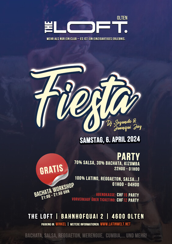 Latinwelt und The Loft presents: FIESTA!!! 🔥💃🏽🥳 SALSA, BACHATA, KIZOMBA und MEHR! 💃🏽 Samstag, 6. April 2024 Dj Segundo & Amigos The Loft. Der Ort in Olten für alle. Mit unserem vielfältigen Konzept wachsen wir mit euch. Mehr als nur ein Club – es ist ein einzigartiges Erlebnis. Eine Talentschmiede direkt neben dem Bahnhof Olten gelegen, ist unser Ziel, die Nummer 1 in der gesamten Region zu werden, indem wir alles daransetzen, unsere Gäste glücklich zu machen. ---------------------------- ★★★ PARTY ★★★ ---------------------------- 100% Salsa, Bachata, Merengue, Son, Timba... und mehr! Party ab 22:00 Uhr --------------------------------- ★★★ WORKSHOP ★★★ --------------------------------- GRATIS! 21:00 Uhr Bachata Open Level Intruktoren: Latinwelt Tanzschule Solothurn Workshop setzt Vorkenntnisse voraus. --------------------------- ★★★ PREISE ★★★ --------------------------- CHF 15.- Party - AK. CHF 12.- Party - VVK. Für den Vorverkauf (VVK): https://www.ticketino.com/de/Event/Fiesta-Salsa-Bachata-und-mehr/188929 ------------------------------ ★★★ ADRESSE ★★★ ------------------------------ The Loft Bahnhofquai 2 - 4600 Olten ★ WEITERE INFORMATIONEN - Garderobe CHF 3.- - Programmänderung vorbehalten - direkt neben dem Bahnhof Olten gelegen - Verschiedene Parkmöglichkeiten in der Nähe Wir freuen uns auf Euren Besuch und auf einen unvergesslichen Tanzabend