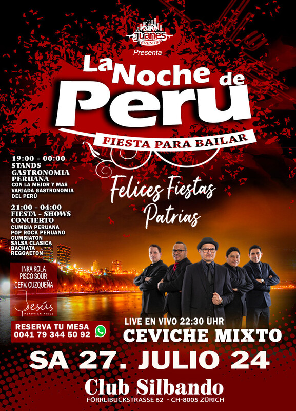 Fiestas Patrias del Perú ● LA NOCHE DE PERÚ● Sa 27. Julio 24 Club Silbando ● Patrias del Perú 2024 ● SABADO 27. JULIO 2024 Zürich ● Club SILBANDO ●●●● ● PARQUE PARA MÁS DE 300 AUTOS A 2 MINT. DEL CLUB. ● CELEBRANDO FIESTAS PATRIAS DEL PERÚ ● 6 STANDS PERUANOS QUE OFRECERAN LOS PLATOS MÁS TÍPICOS DEL PERÚ. ● APERTURA DE LOS STANDS GASTRONOMICOS 19:00 UHR, ENTRADA GRATUITA. ● DESDE LAS 21:00 FIESTA CON DJS, SHOWS Y ● GRUPO EN VIVO: CEVICHE MIXTO. ●●●●● Bienvenidos a todos nuestros compatriotas Peruanos y amigos residentes en Suiza, a celebrar Las Fiestas Patrias del Perú en Club Silbando, un programa completo en un ambiente puramente Peruano, Musica en Vivo, DJs, Show, y Buena fiesta. ●●●●● APERTURA: A las 19:00 se abren las puertas ala entrada ala Terraza al aire libre, entrada gratis, usted podra disfrutar de 6 Stands con la mejor y mas variada Gastronomía del Perú. STANDS GASTRONOMICOS. ●●●●● ● Stand by: SUSPIROS: ● LOMO SALTADO ● CEVICHE ●●●●● ● Stand by: SAZON DE ZUNNY ● SECO DE CARNE ● PAPA RELLENA ● TAMALES ●●●●● ● Stand by: ROSITA DEL LAGO: ● ANTICUCHOS ● ARROZ CON POLLO ● PAPA ALA HUANCAINA ●●●●● ● Stand by: POSTRES DOÑA JULIA ● MAZAMORRA CON ARROZ CON LECHE ● ALFAJORES ● 3 LECHES ● TORTA SE CHOCOLATE ● TORTA DE MANJAR BLANCO ● PIE DE LIMON ●●●●● ● BEBIDAS DEL PERÚ: Inka Cola, Pisco Sour y Cuzqueña. ● PISCO SOUR preparado por JESUS PERUVIAN PISCO (Perú) ●●●●● ● LA ENTRADA Y BEBIDAS SE PAGA SOLO EN EECTIVO. ●●●●● ● RESERVA TU MESA: 079 344 50 92 Envíanos un Mensaje por Whatsapp, con Nombre y Apellido y cantidad de invitados. ●●●●● FIESTA: DESDE LAS 21:00 EMPIEZA LA FIESTA con DJ KENNY del PERÚ, ofreciendo los temas más sonados de hoy y ayer. Cumbia Peruana, Rock & Pop Peruano, Cumbiaton, Bachata, Reggaeton, Salsa. ●●●●● 21:30 UHR SHOW FOLCLORICOS DEL PERÚ: ● SHOW DE MARINERA NORTEÑA ● VALICHA ● HUAYLAS ●●●●● EN VIVO : 22:30 CEVICHE MIXTO Con lo mejor de su Repertorio, Cumbia, Pop Rock Peruano, Salsa y fiesta. ●●●●● LUGAR: CLUB SILBANDO Förrlibuckstrasse 62 8005 Zürich ●●●●● MAPA COMO LLEGAR: https://map.search.ch/Z%C3%BCrich,F%C3%B6rrlibuckstr.62 ●●●●● TRAM: Desde la Estacion Central HB, tomas el TRAN Nr. 4 Dirección Escherwyssplatz, bajas en la parada Escherwyssplatz y caminas 5 minutos, SEGUIR EL MAPA ●●●●● PARQUEO: Llegando al Local Club Silbando, el parqueo se encuentra a 2 mint. Caminando, siga la misma calle Förrlibuckstrasse hasta el nr. 151, ahí encontrara un edificio grande de Parqueo. ●●●●● Bienvenidos Juanes Events Telf: 0041 79 344 52 902 Mail: juan@juanesevents.ch www.juanesevents.ch http://juanesevents.ch/