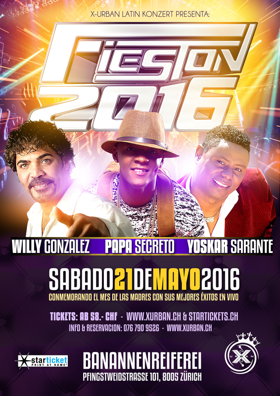 En el mes de las Madres X-Urban te trae un super Regalo. Los tres géneros mas populares en una misma Tarima, una misma Noche. Representando la Salsa, el clásico de los clásico, toda una Leyenda viviente “Willy Gonzalez”. Representando la Bachata, con sus mejores Exitos “Yoskar Sarante” y por ultimo representando lo mas pegado del Momento la Música urbana, Papa Secreto. No te lo pierdas, este sábado 21 de mayo en el mes de las Madres el FIESTON 2016. Fiestón 2016 Willy Gonzalez-Yoskar Sarante-Secreto Sa.21 Mayo Banannenreiferei Pfingstweidstrasse 101 8005 Zürich Info y Reservaciones: 076 790 9526 Tickets: www.xurban.ch & starticket.ch