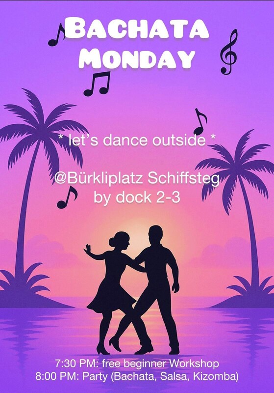 Salsa, bachata and kizomba music + entertainment at Shiffsteg (tram stop Bürkiplatz) from 19.30 pm on Monday. We play around 70% Bachata, 30% Salsa/Kizomba 🎶 The party will only take place if there is no rain. For more info and updates: https://chat.whatsapp.com/K0JPdyd7W8h2HwYCcbFTpv Location: https://maps.app.goo.gl/hyp2g5qZtdoqA4NR9