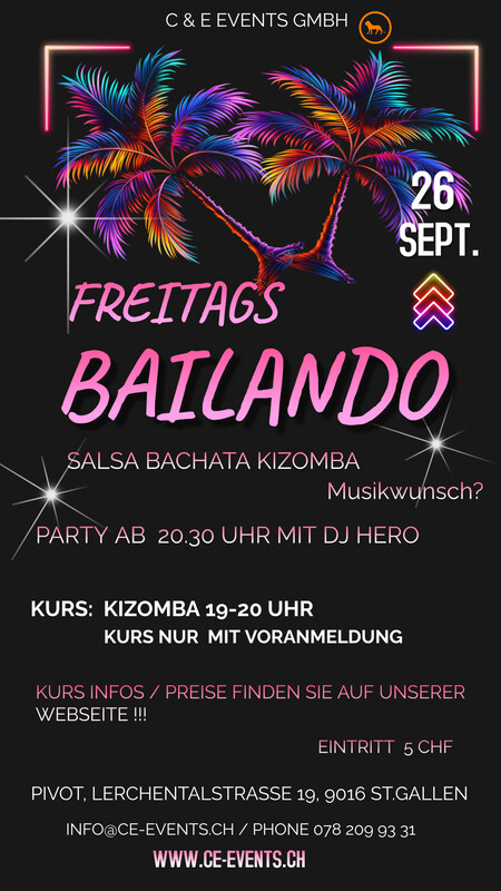 Lasst uns abtanzen und das Leben feiern am Freitag den 26. September im Pivot in St.Gallen!! Kizomba Kurs jeden Freitag von 19 - 20 Uhr Kurse nur mit Voranmeldung Party Eintritt 5 CHF Party ab 20.30 Uhr mit DJ Hero Anmeldung und Infos: Phone 078 209 93 31 oder per Mail an info@ce-events.ch Wir freuen uns auf einen schönen Abend mit Euch! www.ce-events.ch