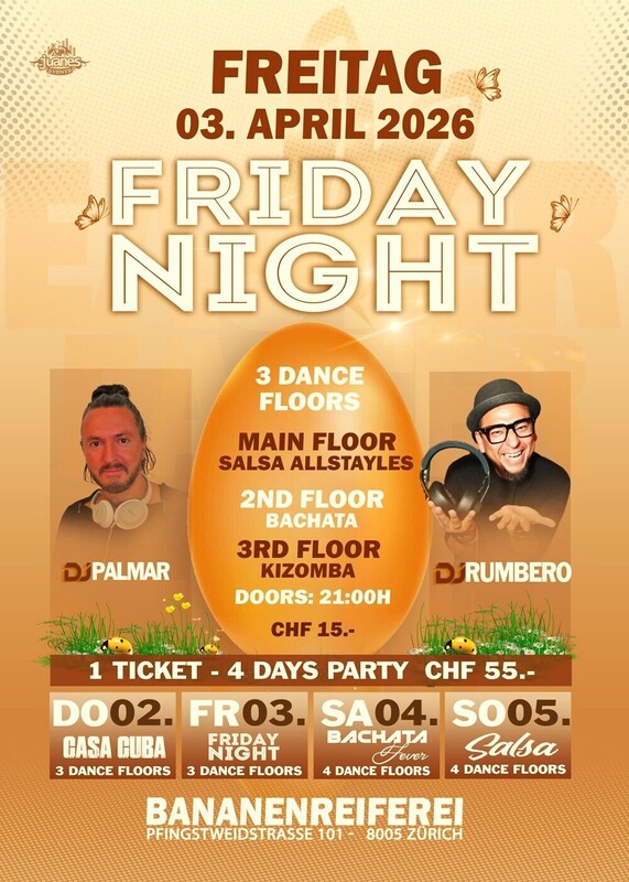 ❀ BIGGEST EASTER SALSA & BACHATA FEVER PARTY OF SWITZERLAND in BANANENREIFEREI ❀ ❀ 1 TICKET 4 TAGE PARTY ❀ DO 02. - FR 03. - SA 04. - SO 05. - APRIL 2026 ❀ SPECIAL EASTER DECORATION ❀❀❀ PARTY PASS: NUR ABENDKASSE CHF 55.- Inkl Alle 4 Tage Party + Garderobe ❀❀❀ ❀ EINTRITT: BEZAHLUNG AN DER KASSE MIT BARGELD ❀❀❀ Du kannst Deinen PARTY PASS für alle 4 Tage am Donnerstag 02.04.25 an der Kasse der Bananenreiferei für CHF 55.- kaufen. Du erhältst eine Karte für alle 4 Tage, die Du am Freitag, Samstag und Sonntag an der Kasse jeweils mit Deinem Ausweis vorzeigen musst, damit Du ohne Probleme reinkommst. ❀❀❀ Willkommen zum SALSA -CUBA-BACHATA- KIZOMBA OSTER PARTY, 4 Tage gute Parties, Non Stop in der Bananenreiferei, Wir wissen, dass wir den besten Club für Tänzer haben, grosse Terrasse, Parkplätze für mehr als 300 Autos im selben Club, beste Tanzflächen für alle Geschmäcker und das Beste von allem, wir haben die besten DJS von Salsa, Cuba, Bachata, Kizomba, die die besten Hits von gestern und heute liefern werden. ❀❀❀ PROGRAMM BANANENREIFEREI ❀❀❀❀❀❀❀❀❀❀❀❀❀ ❀ PROGRAM FREITAG 03. APRIL 2026 ❀ 3 DANCE FLOORS ❀ SALSA FRIDAY NIGHT ❀ Doors 21:30 bis 03:00 Uhr ❀ Abendkasse CHF 15.- ●●● ❀ MAIN FLOOR: SALSA ALLSTYLES ❀ 368 M² DANCE FLOOR ❀ DJ RUMBERO ❀ DJ PALMAR ●●● 2ND FLOOR: 100% BACHATA ❀ DJ GIOVANNI ●●● 3RD FLOOR: KIZOMBA ❀ DJ XAVIX ●●● ❀❀❀❀❀❀❀❀❀❀❀❀❀ ❀❀❀❀❀❀❀❀❀❀❀❀❀ ❀ PROGRAMM SAMSTAG 04. APRIL 2026 ❀ BACHATA FEVER ❀ 4 DANCE FLOORS ❀ Doors Party 21:30 bis 04:00 Uhr ❀ Abendkasse CHF 20.- inkl. Garderobe ●●● 20:30 UHR, BACHATA WORKSHOP . WORKSHOP BY BACHATA MARCUS PAULO von DANCE SPOR ZÜRICH . Stye: SENSUAL FUSION . Label: INTERMEDIATE ●●● 20:30 UHR, KIZOMBA WORKSHOP MIT SARA & AKRAM von UDANCE STUDIO ZÜRICH . Stye: KIZOMBA . Label: OPEN LABEL ● Sie brauchen nicht zu buchen, kommen Sie direkt zum Bananenreiferei am Samstag 04 April 26 um 20:15 Uhr. Der Workshop Preis ist CHF 25.- Inkl. Garderobe & Party auf 4 Dance Floors. ●●● ❀ MAIN FLOOR: BACHATA FEVER. ❀ 368 M² 100% Bachata Floor ❀ DJ SSAY (Genf) ❀ DJ ENGEL (Ticino) 100% Bachata Fusion / Sensual / Moderna / Clasica / Del Recuerdo ●●●● 2ND FLOOR: 100% CUBANO ❀ DJ RUMBERO ●●●● 3RD FLOOR: KIZOMBA ❀ DJ DERECK ●●●● 4TH FLOOR: SALSA ALLSTYLES ❀ DJ GIOVANNI ●●●● ❀❀❀❀ ❀❀❀❀❀❀❀❀❀❀❀❀❀ ❀❀❀❀❀❀❀❀❀❀❀❀❀ ❀ PROGRAMM SONNTAG 05. APRIL 2026 ❀ 4 DANCE FLOORS ❀ SALSA ALLSTYLES ❀ Doors 21:30 bis 04:00 Uhr ❀ Abendkasse CHF 20.- inkl. Garderobe ●●●● ❀ MAIN FLOOR: SALSA ALLSTYLES ❀ 368 M² DANCE FLOOR ❀ DJ RUMBERO ❀ DJ GALANTE Salsa Allstyles, Cubano, Puertorriqueña, Clasica, del Recuerdo ●●● 2ND FLOOR: 100% CUBANO ❀ DJ MANUEL ●●● 3RD FLOOR: 100% BACHATA ❀ DJ GIOVANNI ●●● 4TH FLOOR: KIZOMBA ❀ DJ XAVIX ●●● AUF DEM DACH DES BANANENREEIEREI HABEN WIR PARKPLÄTZE FÜR 300 AUTOS. ●●● LOCATION: BANANEREIFEREI Pfingstweidstrasse 101 8005 Zürich ●●● Beinvenidos Juanes Events https://juanesevents.ch/