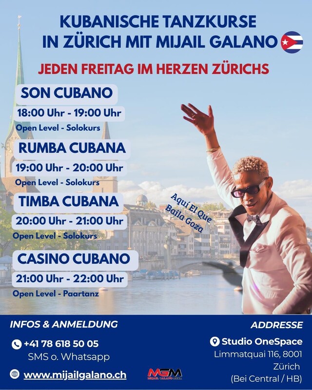 Freitags in Zürich Kubanische Tanzkurse mit Mijail Galano Son Cubano Rumba Cubana Timba Cubana Casino Cubano Info & Anmeldung 078 618 50 05 Aquí El Que Baila Goza www.mijailgalano.ch