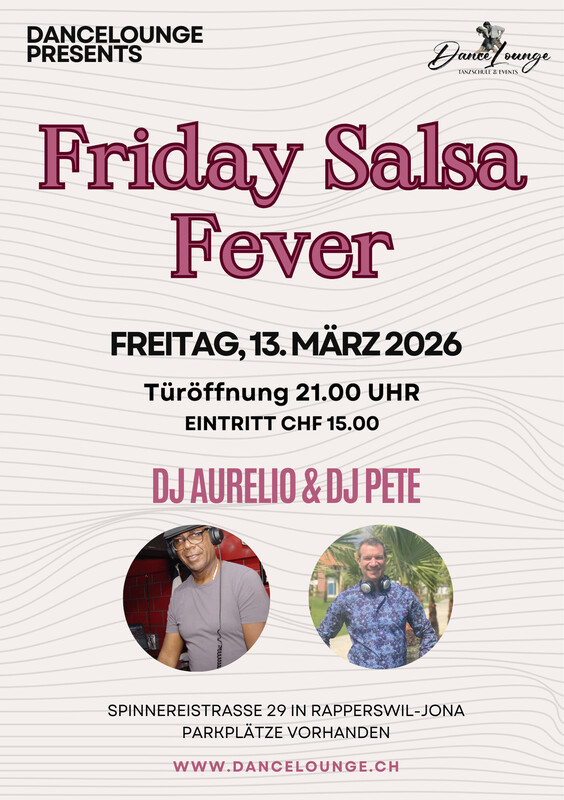 1x im Monat führen wir in der Dancelounge die Friday Salsa Fever durch. DJ Aurelio, DJ Manuel und DJ Pete führen durch den Latin-Abend abwechseln mit Salsa, Bachata, ChaCha usw. https://www.dancelounge.ch/index.php/event/salsa-fridays-mit-dj-aurelio-dj-pete-4/
