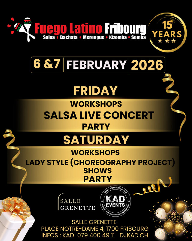 ★☆★Fuego Latino "15TH ANNIVERSARY★☆★ - WORKSHOP - PARTY - SHOW Adresse : Salle Grenette, Place Notre-Dame 4, 1700 Fribourg Infos : Kad 079 400 49 11 / www.djkad.ch www.djkad.ch www.djkad.ch