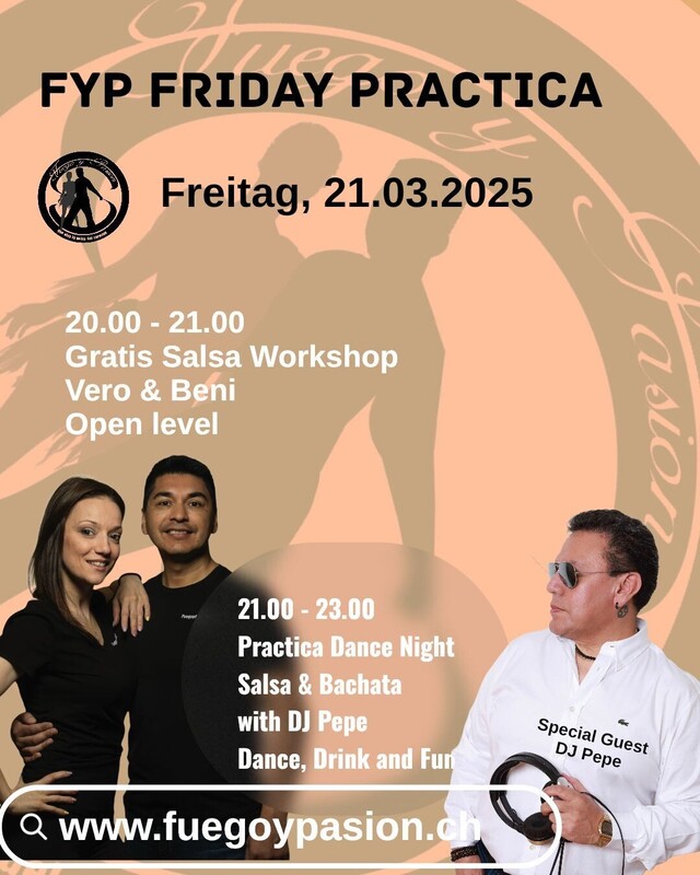 FUEGO Y PASION PRACTICA Nicht verpassen: Gratis Practica und kostenloser Workshop in einer Spezialedition Salsa & Bachata. Der kostenlose Workshop Salsa findet von 20:00 bis 21:00 Uhr statt. Veronica Di Leo & Beni Castro. Wann? Freitag , 21.03.2025, von 20:00 bis 23:00 Uhr. Ab 21:00 Uhr Salsa- und Bachataparty mit DJ Pepe aus Basel. Alle sind eingeladen – Öffentlich für alle! Wir freuen uns auf das Team Fuego y Pasión! Salsa Tanzschule Fuego y Pasion Weststrasse 74 8003 Zürich