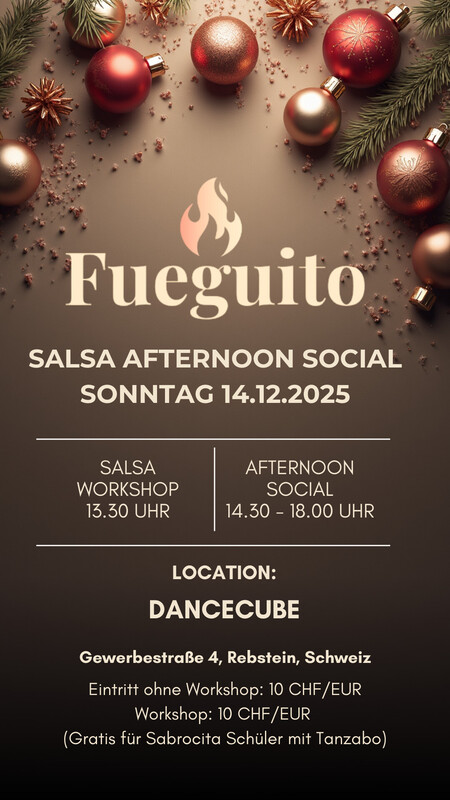 Fueguito, die kleine Schwester von Salsa Fuego, lädt zu einem gemütlichen und entspannten Afternoon Social ein – für alle, die Salsa tanzen, üben, genießen oder sich austauschen möchten. Ganz egal, welchen Stil du tanzt oder wo du Salsa lernst – wenn Salsa zu deinem Leben gehört, bist du hier genau richtig. Wir starten mit einem Salsa Workshop (Open Level, alle Stile willkommen), danach tanzen wir gemeinsam in einer lockeren, warmen Atmosphäre weiter. Die Musik kommt von DJane Sabrocita – viel Salsa, ergänzt durch etwas Bachata & Cha Cha Cha. Programm 13:30 – Salsa Surprise Workshop (Open Level) 14:30–18:00 – Afternoon Social 🎧 Musik: Salsa by DJane Sabrocita + ein wenig Bachata & Cha Cha Cha Eintritt Social: 10 EUR/CHF Workshop: 10 EUR/CHF Workshop gratis für Sabrocita-Schüler*innen Fueguito ist ein Ort für alle Salsa-Liebhaber*innen – ein Nachmittag voller Musik, Leichtigkeit und guter Stimmung. Wir freuen uns auf dich. https://www.salsalust.at