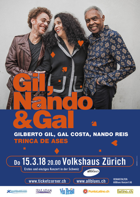 Gilberto Gil, Gal Costa, Nando Reis «Trinca De Ases» Sie sorgten 2017 für Furore in Brasilien, kommen jetzt für wenige, ausgewählte Konzerte im März 2018 nach Europa und am 15. März zum Glück auch ins Volkshaus Zürich: Die Reunion dreier Ikonen der Música Popular Brasileira, von Gilberto Gil, Gal Costa und Nando Reis. Luftige Gitarrenakkorde im Zwiegespräch, Gal Costas Wunderstimme intoniert die perlenden Songs von Gil und zusammen feiern sie die Folk-Pop-Rock-Songs von Nando Reis – ein feinsinniges Konzertspektakel, wie man es heutzutage nur selten mehr erlebt. Die drei musizieren in jeder möglichen Kombination: Trio, Duette oder solo, begleitet vom Bassisten Magno Brito und dem Perkussionisten Kainan do Jejê. Drei Musketiere, drei Songpoeten oder eben «Trinca de Ases»: Für alle Fans der «Musica do Brasil» wird der 15. März zum Fest und zu einem Höhepunkt des Konzertfrühlings. ERSTES UND EINZIGES KONZERT IN DER SCHWEIZ PREISE: CHF 120/100 (nummerierte Sitzplätze Balkon/Galerie); CHF 75 (Stehplätze Parkett) VORVERKAUF: www.allblues.chwww.ticketcorner.ch • Alle Ticketcorner, Die Post, Manor, SBB • Tel. 0900 800 800 (CHF 1.19/min.) DIREKTLINK: http://allblues.ch/Gil-Nando-e-Gal/2144 AKTUELLE ALBUEN: Gilberto Gil: Two Friends, One Century (2016/Sony) • Gal Costa: Recanto (2012/Harmonia Mundi) • Nando Reis: Jardim - Pomar (2016) WEBSITES: www.gilbertogil.com.brwww.galcosta.com.brwww.nandoreis.com.br