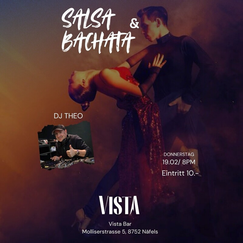Donnerstag 19. Februar Party SALSA & BACHATA All Styles mit DJ Theo 20.00 Uhr bis 23.55 Uhr Eintritt 10.- Genügend kostenlose Parkplätze vorhanden. VISTA BAR Molliserstrasse 5 8752 Näfels (Glarus) www.vista-bar.ch www.facebook.com/vistabarCH FACEBOOK: https://fb.me/e/fophYcAaY