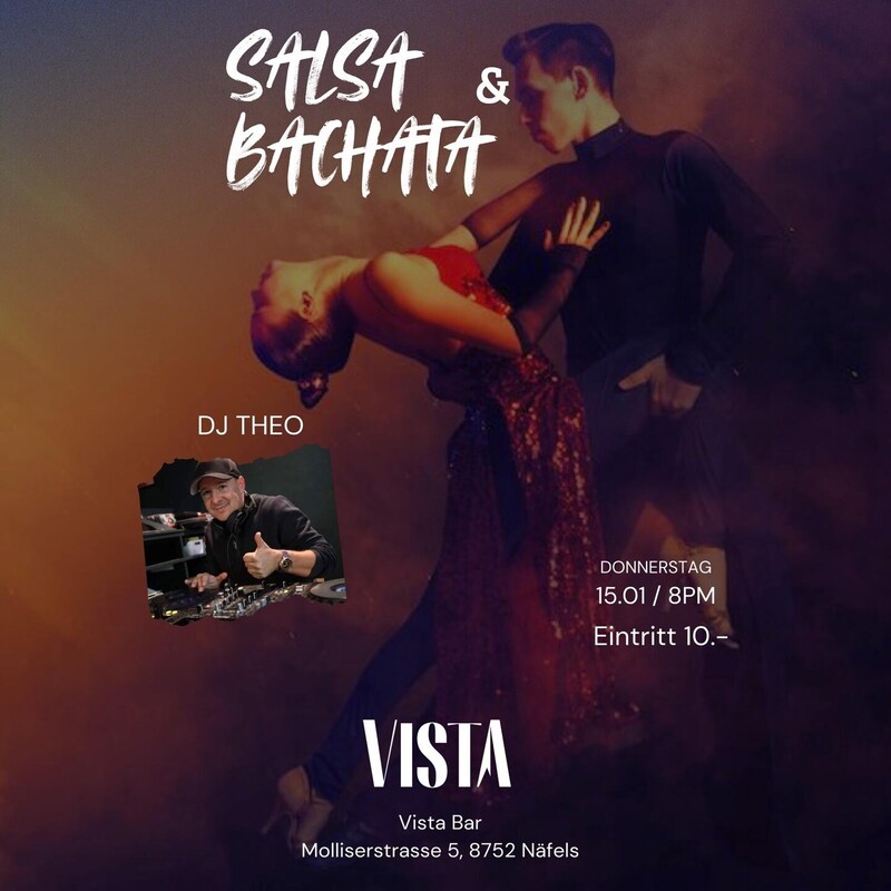 Donnerstag 15. Januar 2026 SALSA & BACHATA PARTY mit DJ Theo immer 1x in Monat 20.00 Uhr bis 00.00 Uhr Eintritt 10.- Genügend kostenlose Parkplätze vorhanden. VISTA BAR Molliserstrasse 5 8752 Näfels (Glarus) www.vista-bar.ch www.facebook.com/vistabarCH FACEBOOK https://fb.me/e/7bhBxoRIZ