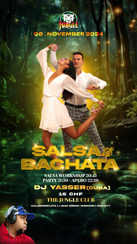 Golden November SALSA & BACHATA * MIRCO & LILLY * * SALSA WORKSHOP * * MIXED DANCE FLOOR * * DJ YASSER (CUBA) * Timetable 20:15 Open Door 20:30 Salsa Workshop 21:30 Party 22:30 Apéro Riche Party | Workshop | Animation 15 CHF Eintritt Check all our events here: www.thejungleclub.ch https://thejungleclub.ch/index.html
