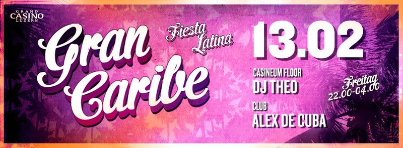 Grand Casino Luzern und I Love Salsa Switzerland Presents: ★ Fiesta Latina GRAN CARIBE ★ Fasnacht Edition Freitag 13. Januar 2015 - Türöffnung 22:00h Die ultimative Latin & Salsa Party in der Zentralschweiz mit 2 Dance Floors, Shows, 2 DJ`s und 5 Stunden "FIESTA" DANCE FLOOR 1 (Casineum) DJ THEO Salsa On1 & On2 / Bachata / Cha Cha Cha / Merengue DANCE FLOOR 2 (The Club) Cuban Floor DJ ALEX Salsa Cubana / Timba / Cubaton / Latin Tropical NÄCHSTE DATEN GRAN CARIBE Freitag, 6. März 2015 PARKHÄUSER LUZERN Damit Sie uns auch finden... Über 1500 Parkplätze in nächster Nähe! http://www.pls-luzern.ch/index.php?section=home EINTRITT Der Eintritt ist 15.- Sfr. ohne Garderobe Garderobe ist Obligatorisch INFOS Der Zutritt ins Casineum ist nur für Personen ab 18 Jahren gestattet. Für den Eintritt ist ein gültiges amtliches Ausweisdokument (Pass, Identitätskarte oder Führerschein) sowie gepflegte Kleidung erforderlich. Eingang ist beim Haupteingang vom Grand Casino Luzern. CASINEUM & THE CLUB @ GRAND CASINO LUZERN Haldenstrasse 6 ,6006 Luzern / Switzerland www.casineum.ch - www.ilovesalsa.ch Lounge Reservierung: Tel: 076 390 09 54 Viel Spass wünschen euch: Yves & Theo.