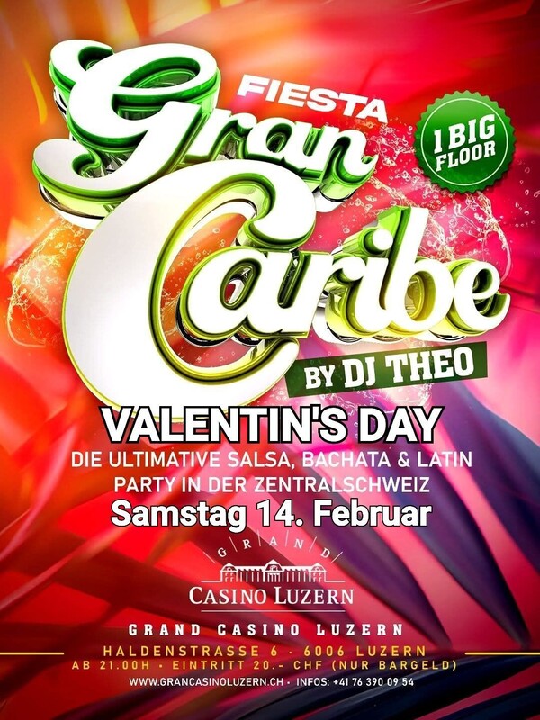 ---------- Valentine's Day ---------- ★ SAMSTAG 14. FEBRUAR 2026 ★ ★ Fiesta GRAN CARIBE by DJ Theo ★ Die ultimative Salsa, Bachata & Latin Party in der Zentralschweiz ★ 20:00h. Türöffnung ★ 20:15h. Workshop Salsa Cubuna mit Yanet Rodriguez (SalsaCafe Sursee) ★ 21:15h. Salsa & Bachata Party mit DJ Theo ★ 02:00h. Party Ende ★ BIG DANCE FLOOR ★ Salsa I Bachata I Merengue I Salsa Cubana I Salsa Puertorriqueña ★ 20h. - 02:00h. Eintritt 20.- Inkl. 1 Workshop (NUR BARZAHLUNG) ★ GRAND CASINO LUZERN ★ Haldenstrasse 6, 6006 Luzern www.grandcasinoluzern.ch ★ INFOS Tel.: 076 390 09 54 ★ Das Casineum im Grand Casino Luzern gehört zu den beliebtesten Ausgehzielen der Zentralschweiz. ★ Der neobarocke Palastsaal bietet ein stimmungsvolles Ambiente und Genuss vom Feinsten für jeden Anspruch. Egal ob im Parterre oder im VIP Bereich auf der Galerie, die Gäste des Casineum geniessen exklusive Club Nächte. Eine Top Sound & Light Inszenierung und nationale DJs runden das Partyvergnügen ab. ★ AUTO PARKHÄUSER LUZERN ★ Damit Sie uns auch finden... Über 1500 Parkplätze in nächster Nähe! http://www.pls-luzern.ch/index.php?section=home FACEBOOK: https://fb.me/e/8pvat06o3