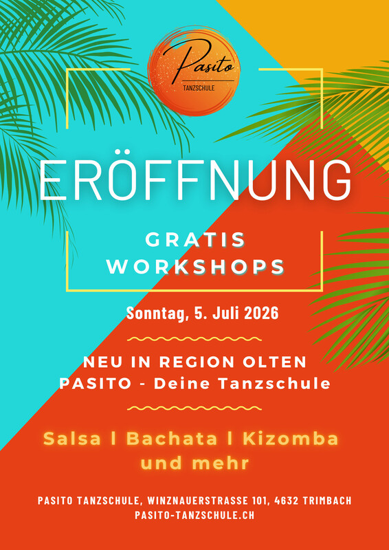 Endlich ist es so weit 💃 Komm vorbei und entdecke die Welt des Tanzens – kostenlos & unverbindlich! ✨ Für Anfänger & Fortgeschrittene ✨ Kein Partner nötig ✨ Verschiedene Stile zum Ausprobieren 👉 Starte mit uns durch und finde deinen Tanz! ⸻ 🕺 Workshop Schedule: 🕚 11:00 Salsa Lady Style – All Levels 🕛 12:15 Bachata – Anfänger 🕜 13:30 Salsa – Anfänger 🕝 14:45 Salsa New York On2 – Anfänger 🕓 16:00 Salsa Cubana – Mittelstufe/Fortgeschrittene 🕔 17:00 Rueda – gute Grundkenntnisse ⸻ 🔥 Sichere dir deinen Platz & sei beim Opening dabei! https://pasito-tanzschule.ch/eroeffnung/