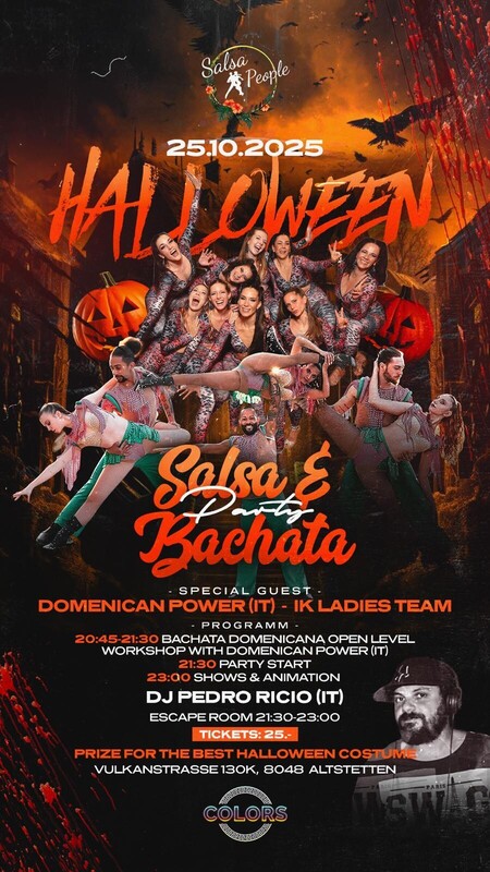 HALLOWEEN INKL. WOKRSHOP SPECIAL SAMSTAG, 25.10.2025 Dresscode: Halloween *** SALSA | BACHATA *** *** 2 DANCE FLOORS *** *** PANIC ROOM BIS 23.00 UHR *** *** BACHATA DOMINICANA OPEN LEVEL WORKSHOP *** *** SHOW ACTS *** *** DJ PEDRO RICIO*** SPECIAL GUESTS Domenican Power (IT) IK Ladies Team DJ Pedro Ricio (IT) WORKSHOP SPECIAL 20:45 - 21:30 Uhr Bachata Domenicana Open Level Workshop by Domenican Power PARTY START - 21.30Uhr Panic Room 21:30 - 23.00 Uhr SHOW ACTS - 23:00 Uhr PRIZE FOR THE BEST HALLOWEEN COSTUME! ===  THE COLORS  === Vulkanstrasse 130k | 8048 Zürich - Swiss life Arena https://salsapeople.ch/workshop https://eventfrog.ch/de/p/party/latin-brasil/salsa-bachata-event-7381270984844691798.html