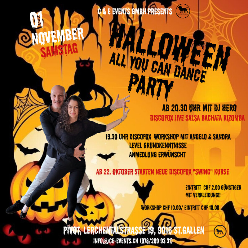 Lasst uns abtanzen und das Leben feiern am Freitag den 1.November im Pivot in St.Gallen!! Party ab 20.30 Uhr mit DJ Hero Discofox Jive Salsa Bachata Kizombe uvm.¨ 1 Discofox Workshop Level Grundkenntnisse mit Angelo & Sandra "Im Discofox/ Disco Swing darf Angelo sich Weltmeister, Vize-Weltmeister und Europameister nennen." Des Weiteren ist er Choreograf, Trainer und seit etlichen Jahren Wertungsrichter. 1 Workshop 10 CHF / Party : 10 CHF Anmeldung erwünscht!! Workshop Anmeldung und Infos: Phone 078 209 93 31 oder per Mail an info@ce-events.ch Wir freuen uns auf einen schönen Abend!! www.ce-events.ch